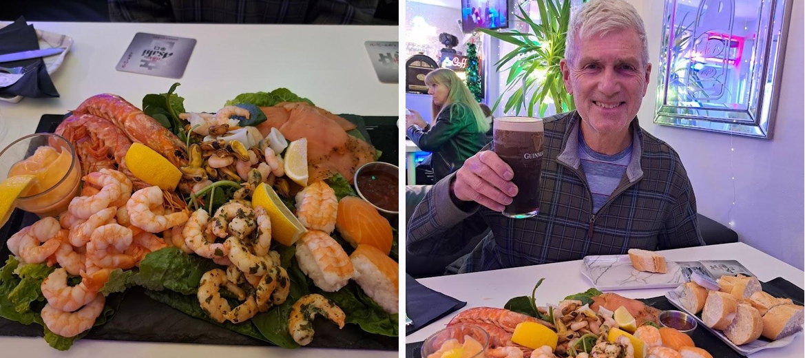 I believe that it's important to support local coastal businesses and especially in winter when the tourist season foot fall is down. Wherever, or not, you're a local, or a visitor to Hayling Island Bar 18 is must visit for a relaxed and fun evening with a great range of wines, on tap and bottled beers and cocktails that look too pretty to drink. On this occasion we pre-ordered our sea food platter which was prepared to our taste as neither of us wanted crab. We phoned ahead of arrival and our platter was ready for us when we arrived. I had crisp and highly quaffable Savignon Blanc and my husband had the draft Guinness. I had a sip of his Guinness. It was chilled to perfection. Our sea food platter was exceptional with a plentiful supply of bread and butter and offers of more bread too! It's clear that Fiona has a passion for preparing and serving good quality food. Fiona and Terry the owners could not have been more kind and welcoming and it's clear they want their customers to relax into the comfort of their squidgy sofas and have an enjoyable time. While we there, we noted our fellow guests enjoying themselves too. Not everyone has a meal but if you and if you haven't pre ordered a sea food or a cheese and meat board then you can order a cheese toasty and crisps which looked super tasty. We're definitely going back because of the warmth of the welcome, the superb quality food and actually but important it's really good value. Thank you Fiona and Terry for creating such a warm and welcoming wine bar. Just perfect.